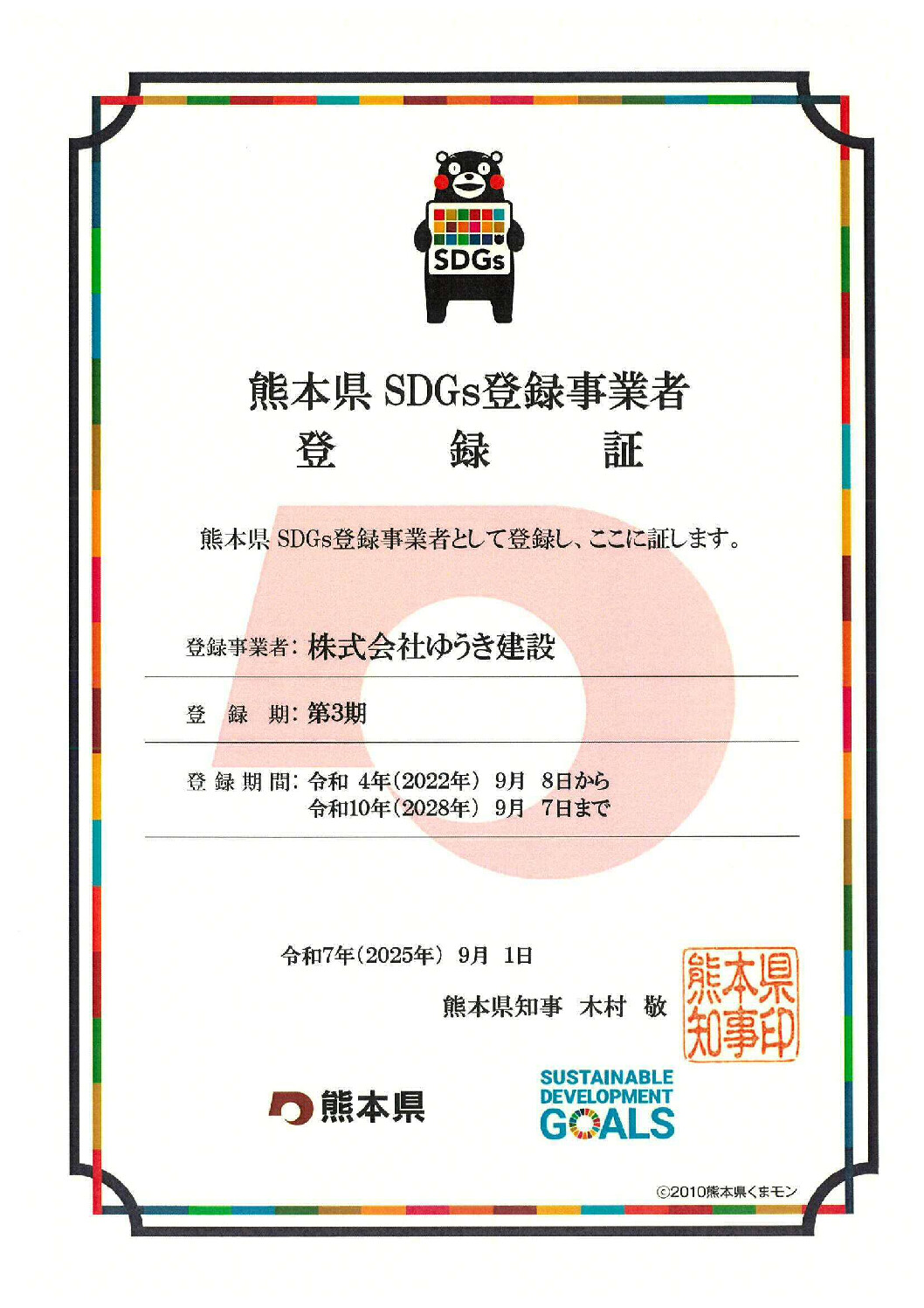 08Sep2025 「熊本県SDGs登録制度」の登録更新をしました この度、熊本県SDGs登録制度の登録更新が完了いたしました。 引続き、持続可能な社会の実現に向けて取り組んでまいります。 熊本県SDGs登録事業者証(~R10) Tweet Share お盆休みのお知らせ 「ヘルスター健康宣言証」届きました 最近のお知らせ一覧お知らせ一覧 「ヘルスター健康宣言証」届きました 2025.12.15 お盆休みのお知らせ 2025.07.30 年末年始休業のお知らせ 2024.12.21 お盆休みのお知らせ 2024.08.05 年末年始休業のお知らせ 2023.12.15